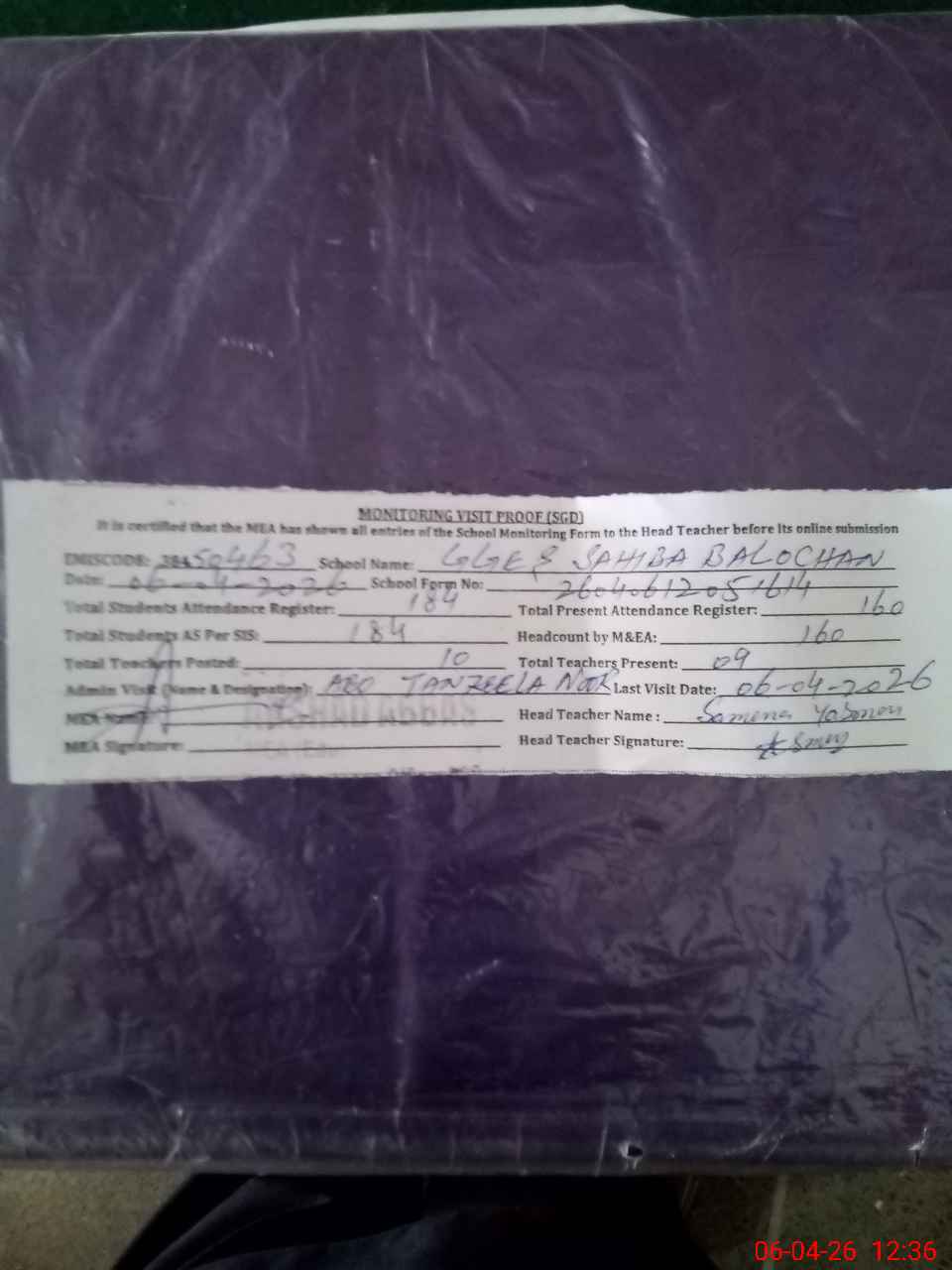 | Attendance Register | Head Teacher | MEA with School | Visit Proof |