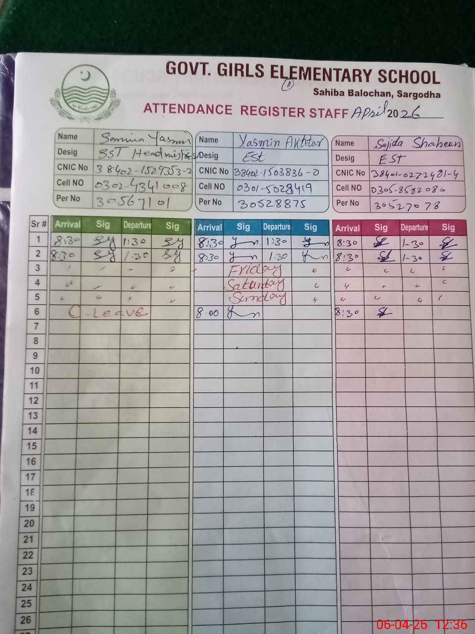 | CNIC | Full Name | Designation | R/C | Absence During Last Calender Month |