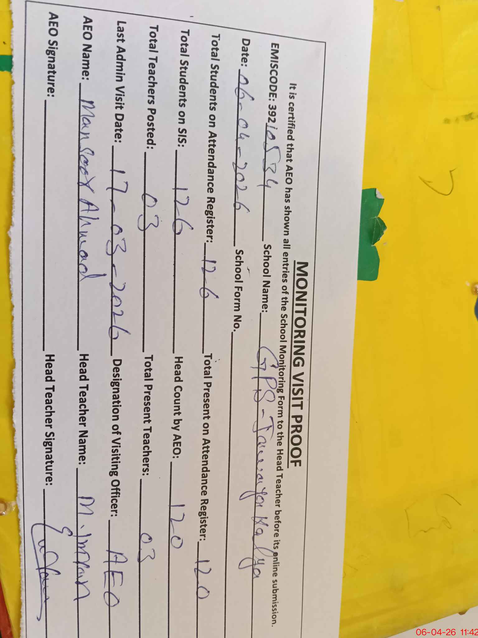 | Attendance Register | Head Teacher | MEA with School | Visit Proof |