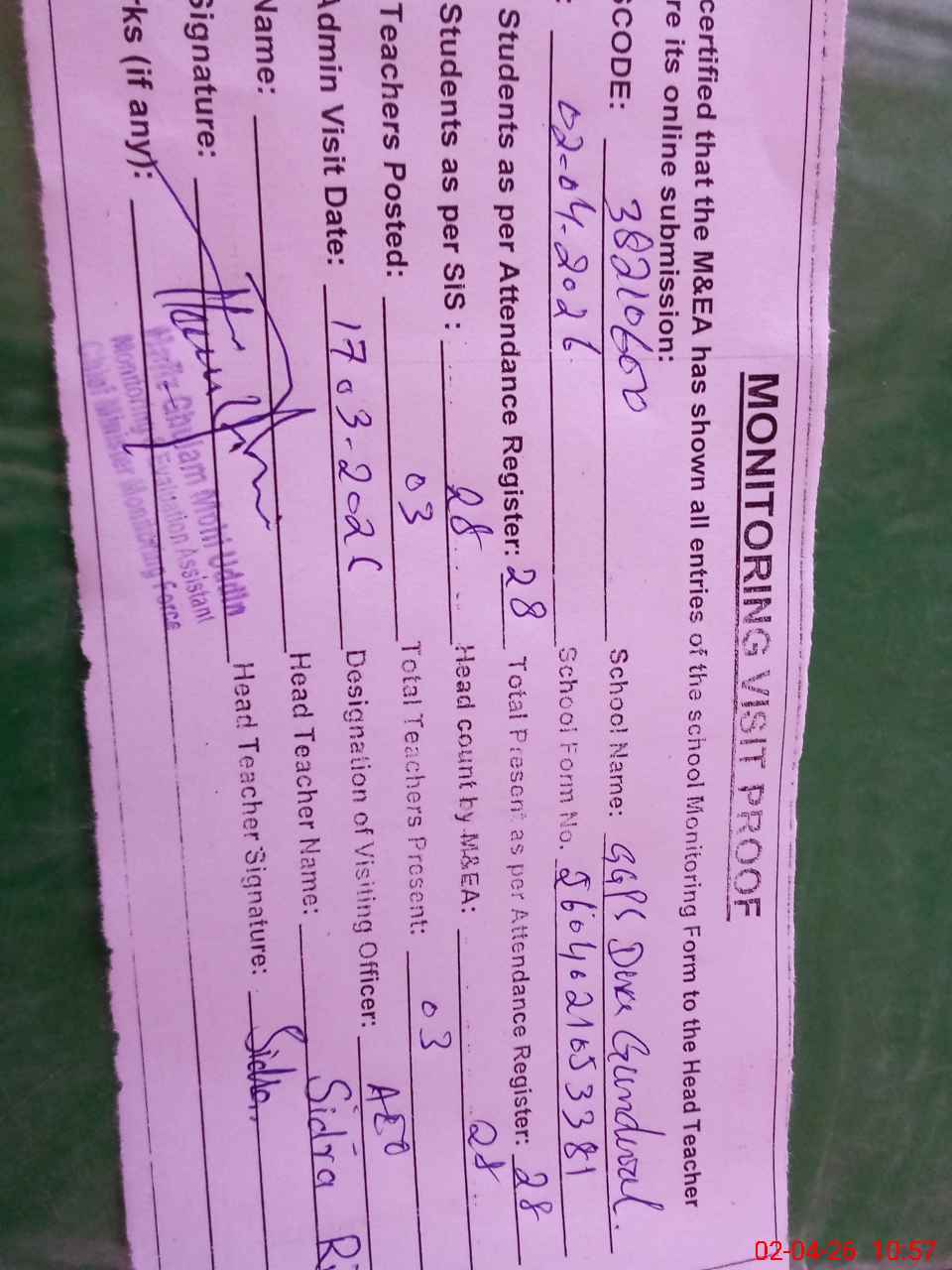 | Attendance Register | Head Teacher | MEA with School | Visit Proof |