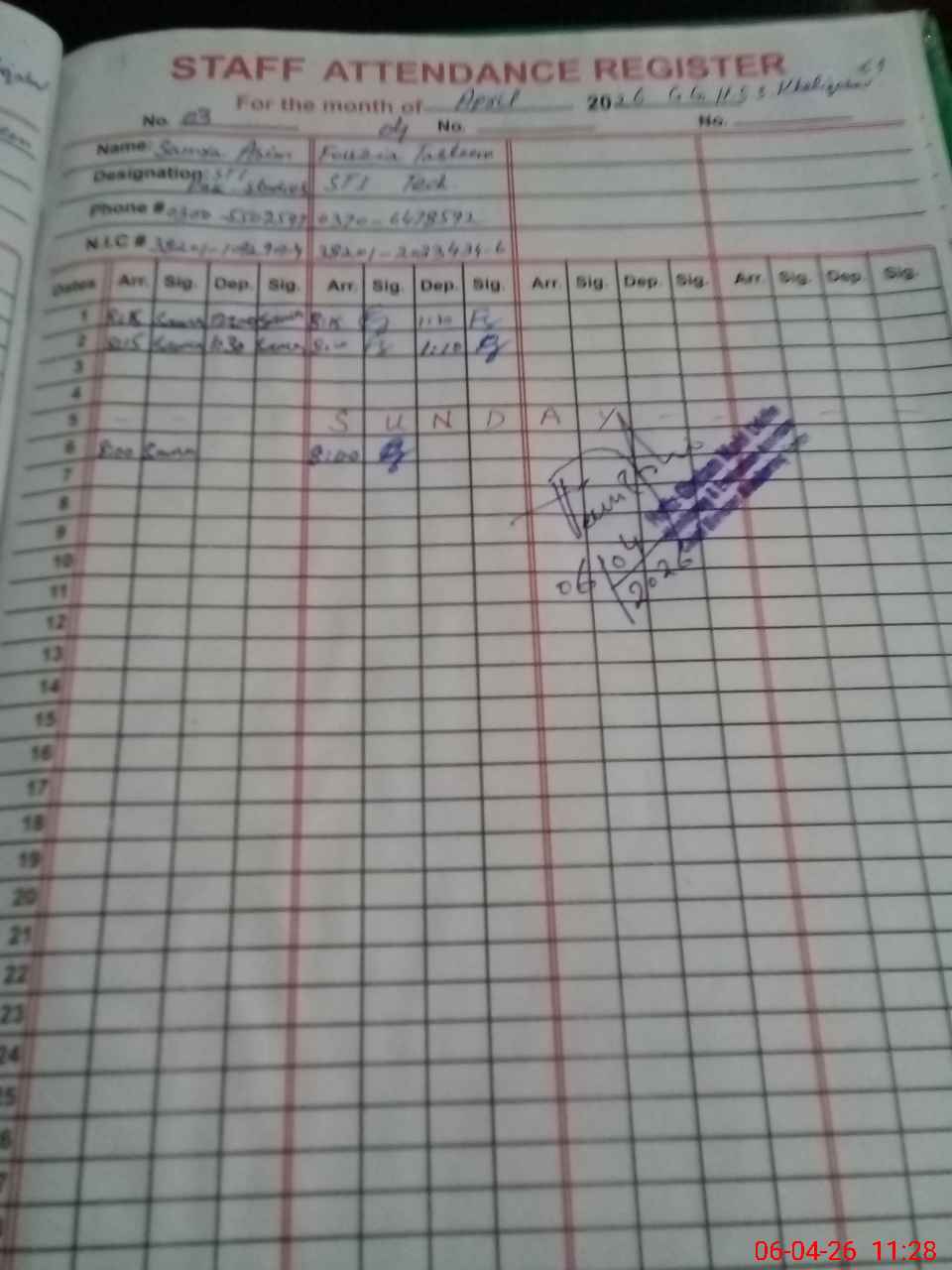 | CNIC | Full Name | Designation | R/C | Absence During Last Calender Month |