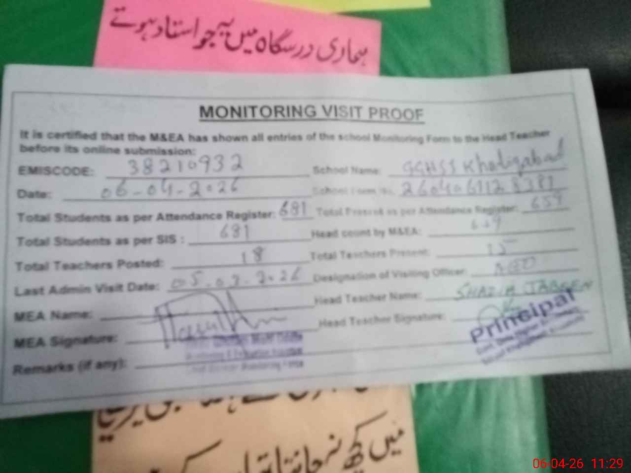 | Attendance Register | Head Teacher | MEA with School | Visit Proof |