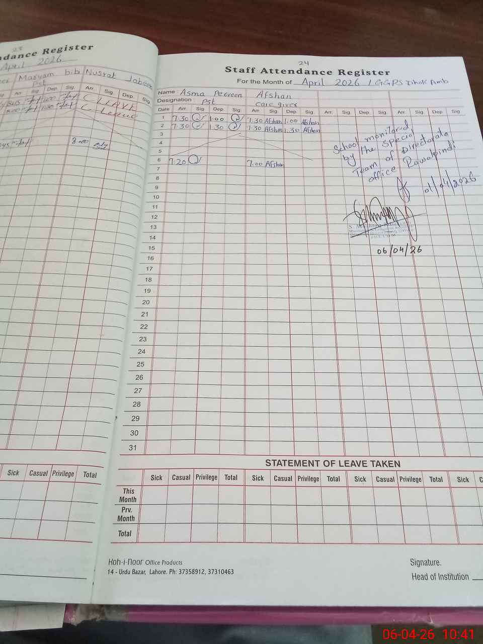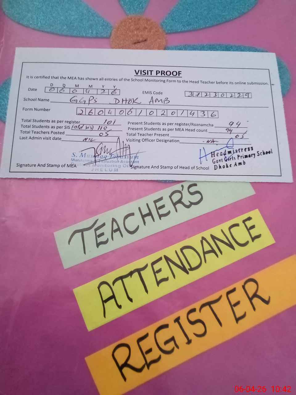| Attendance Register | Head Teacher | MEA with School | Visit Proof |
