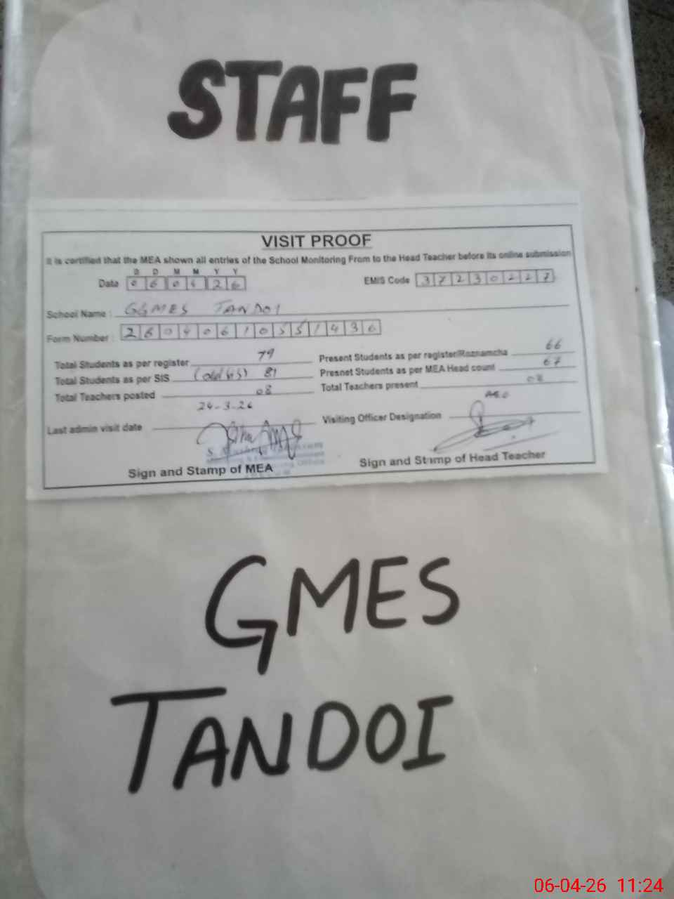 | Attendance Register | Head Teacher | MEA with School | Visit Proof |