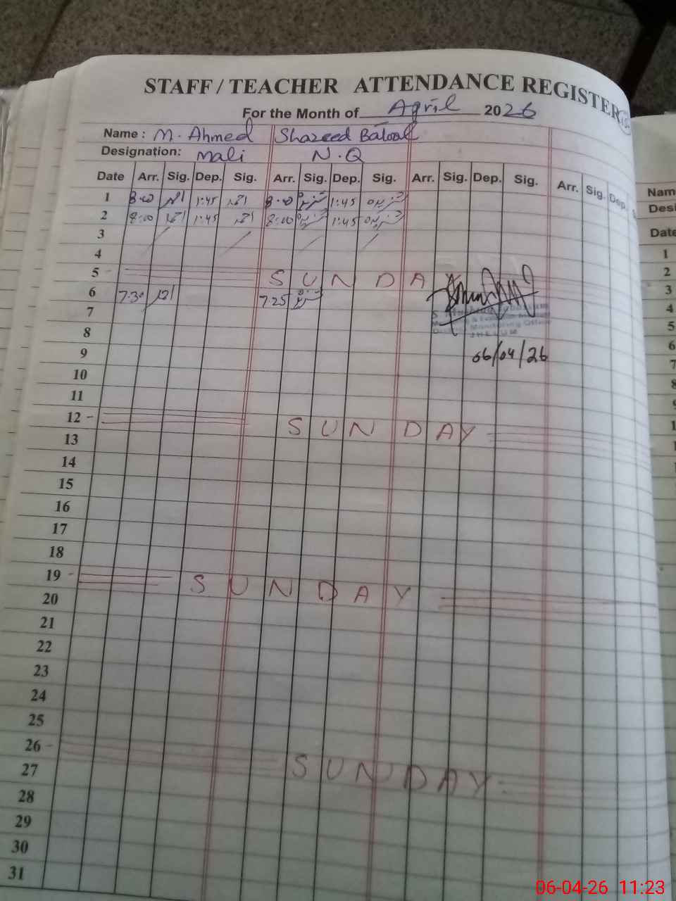 | CNIC | Full Name | Designation | R/C | Absence During Last Calender Month |