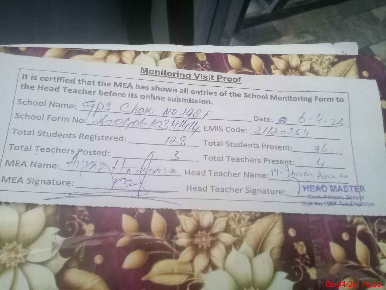 | Monitoring Date: 06-04-2026 | Start Time: 06-04-2026 10:34 AM | End Time: 06-04-2026 11:00 AM | Name of MEA: M.**** HA**** BN**** | |