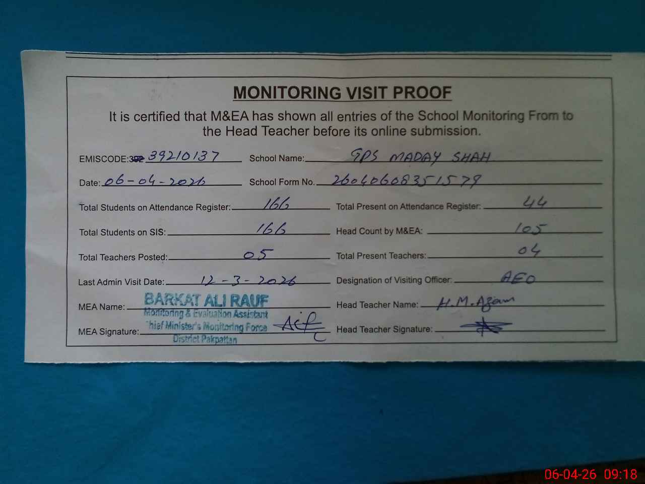 | Attendance Register | Head Teacher | MEA with School | Visit Proof |