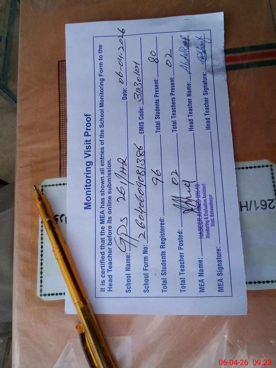 | Attendance Register | Head Teacher | MEA with School | Visit Proof |