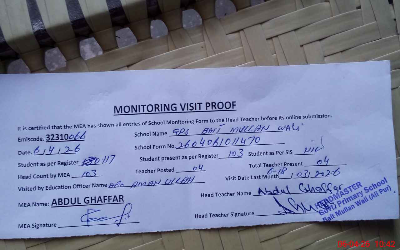| EMIS Code: 32310066 | Name of School: GPS BAIT MULLAN WALI | |||