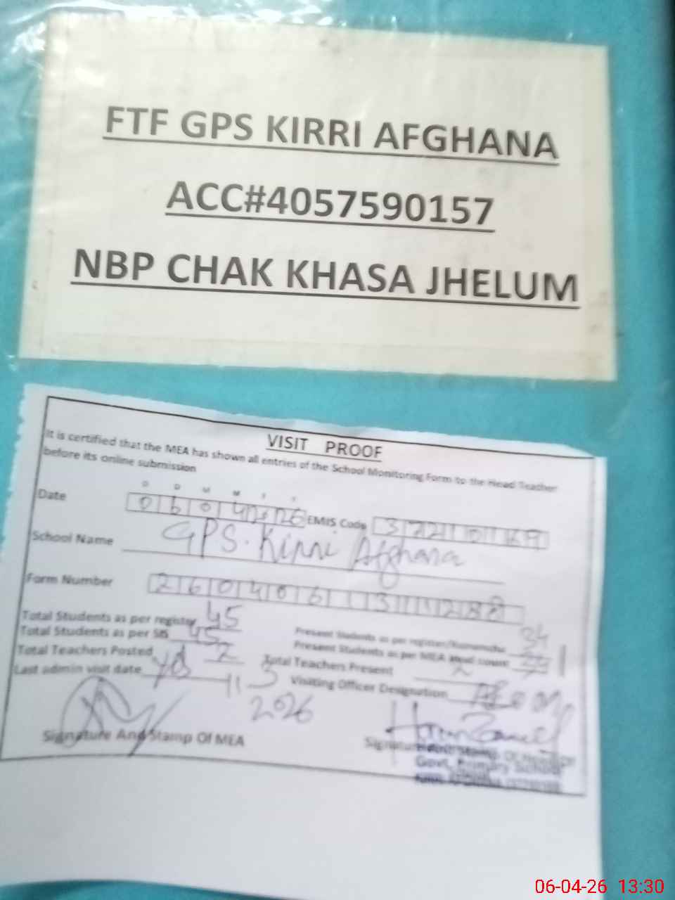 | Attendance Register | Head Teacher | MEA with School | Visit Proof |