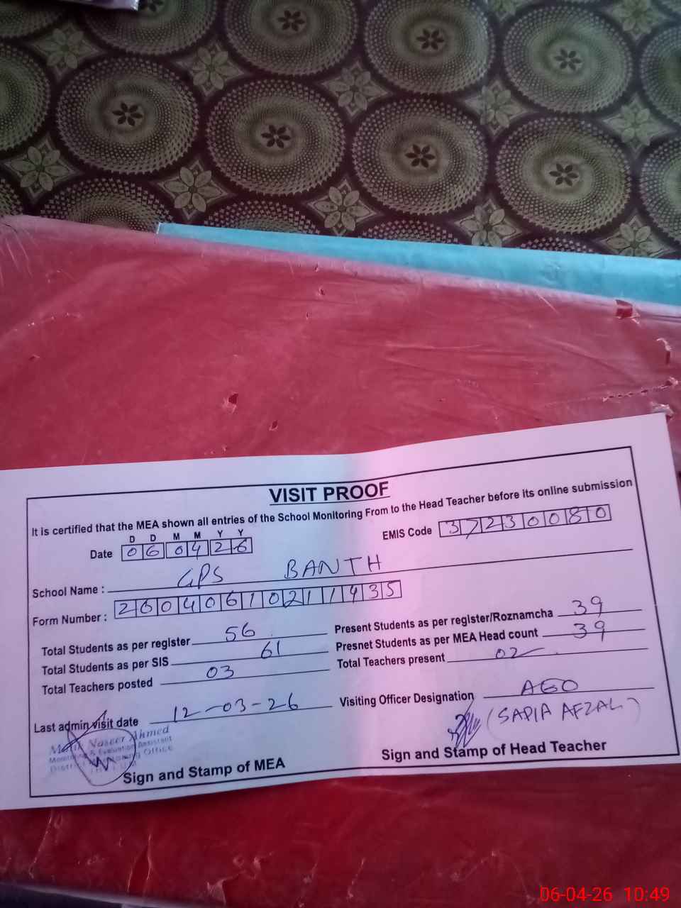 | EMIS Code: 37230080 | Name of School: GPS BANTH | |||