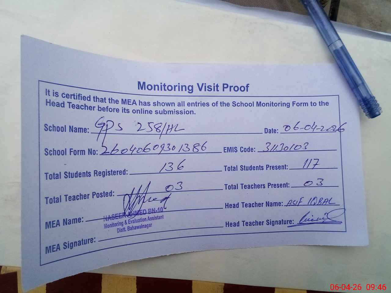 | Attendance Register | Head Teacher | MEA with School | Visit Proof |
