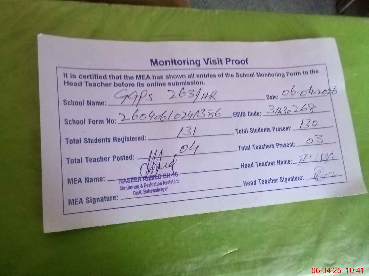 | EMIS Code: 31130268 | Name of School: GGPS CHAK NO. 263 HR | |||