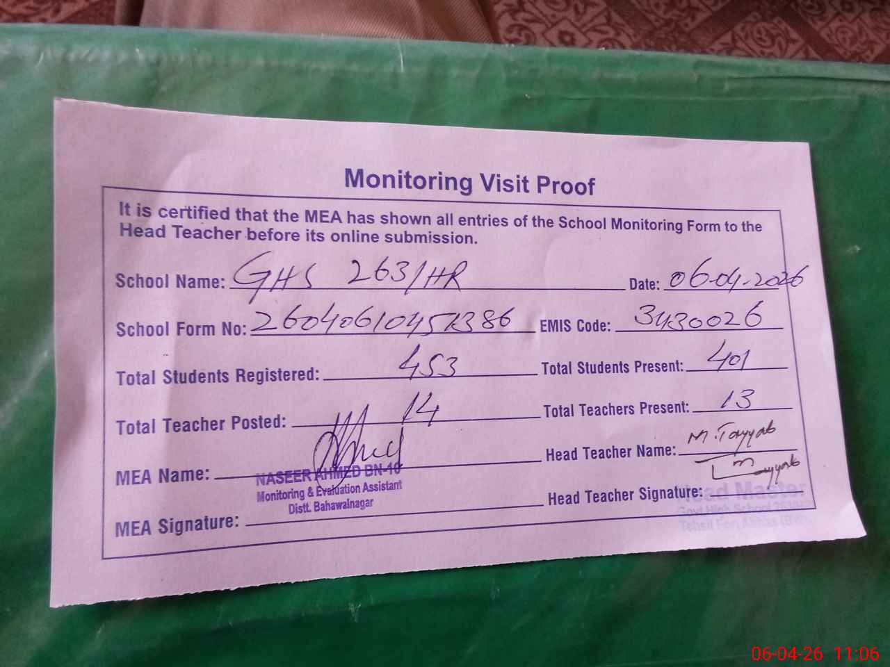 | Attendance Register | Head Teacher | MEA with School | Visit Proof |