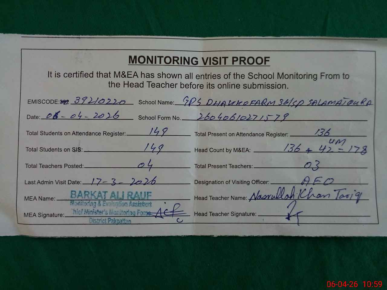 | EMIS Code: 39210220 | Name of School: GPS DHAKKO FARM CHAK NO. 36/SP SALAMAT PURA | |||