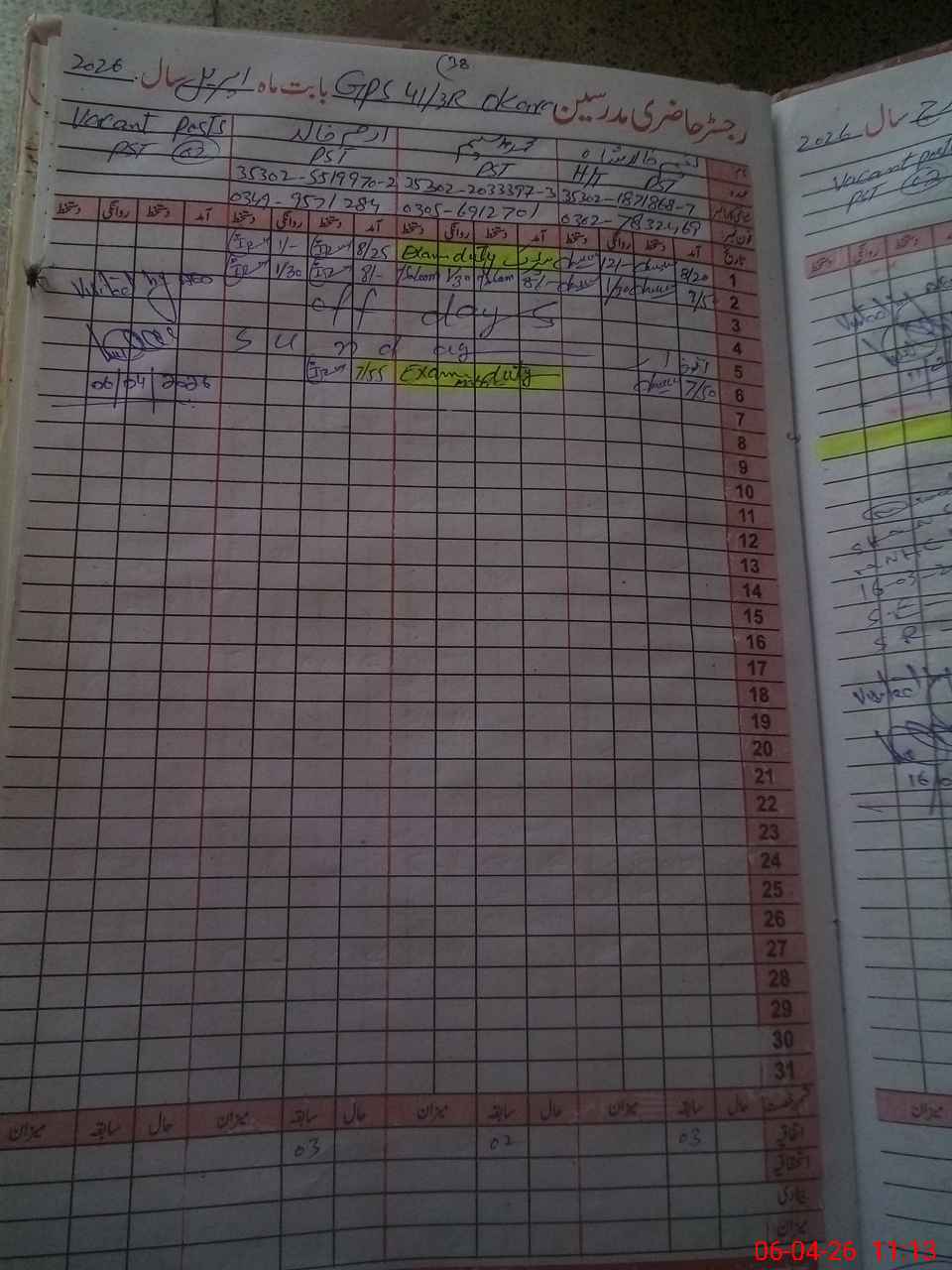 | 35**** | Mu**** Sa**** | PST Arts | Regular | 0 | 0 | 0 | 0 | 0 | 0 | 0 | 0 | 0 | Exam Duty |