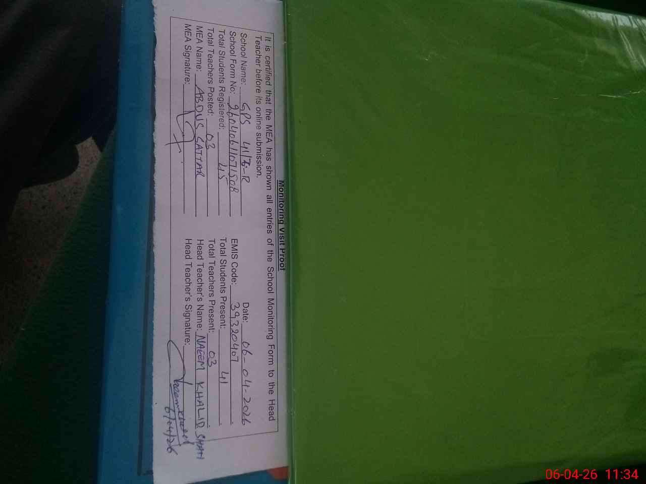 | Attendance Register | Head Teacher | MEA with School | Visit Proof |