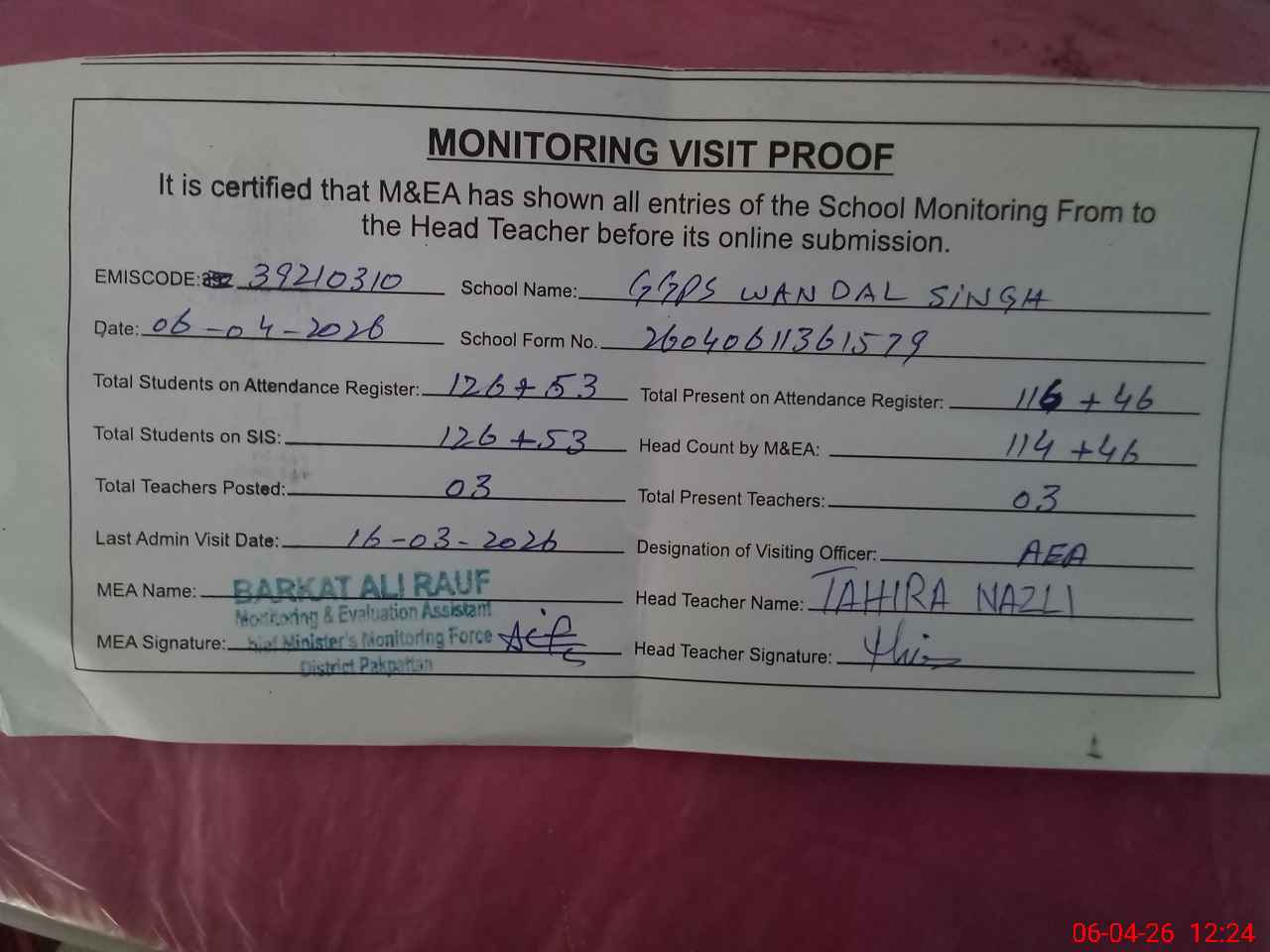 | Attendance Register | Head Teacher | MEA with School | Visit Proof |