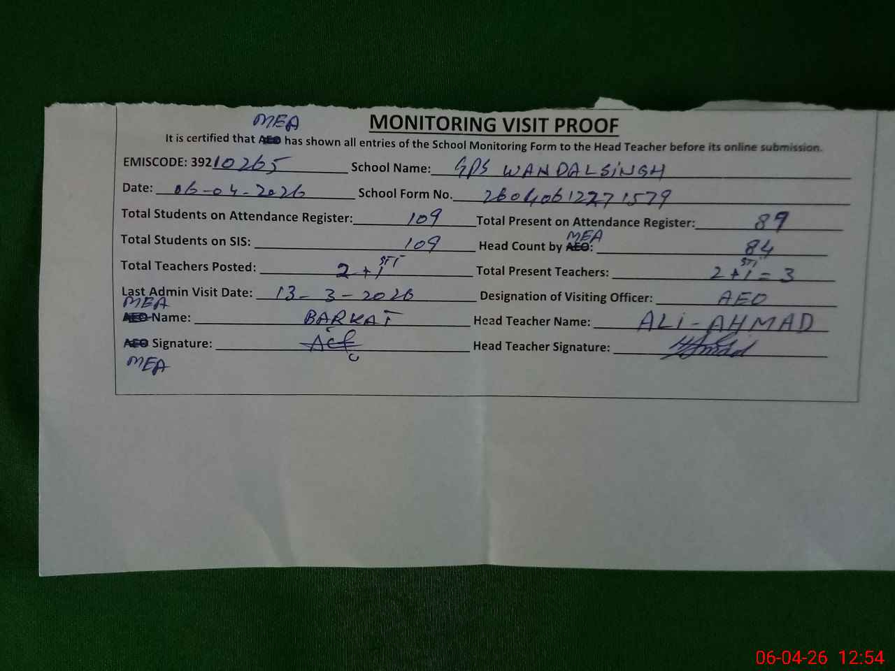 | EMIS Code: 39210265 | Name of School: GPS WANDAL SINGH | |||