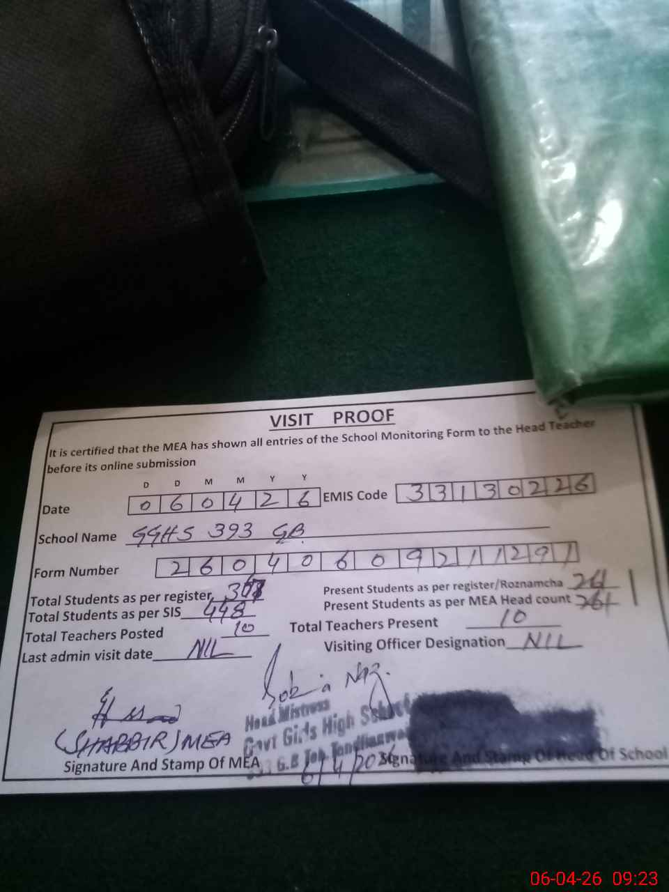 | Attendance Register | Head Teacher | MEA with School | Visit Proof |