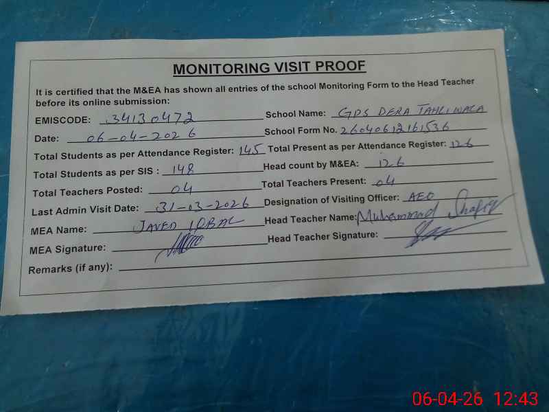 | EMIS Code: 34130472 | Name of School: GPS DERA TAHLI WALA | |||
