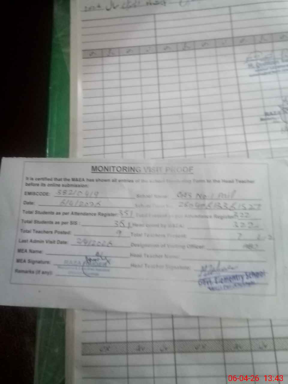 | Attendance Register | Head Teacher | MEA with School | Visit Proof |