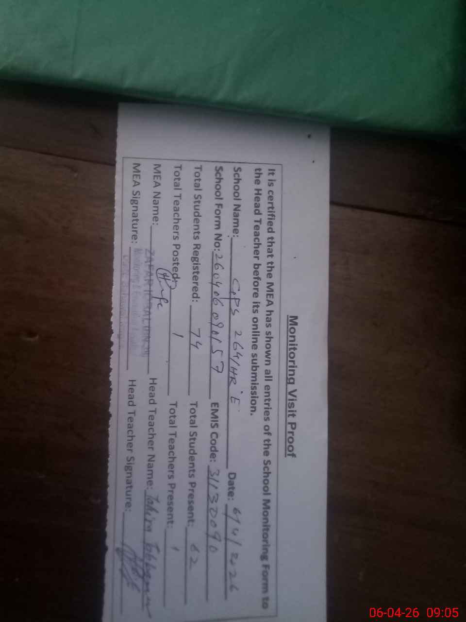| Remarks (Use Separate Page if Required): student books still not issued AEO not visited this school in last month of March 2026 Both wash room cleansing poor | |||||