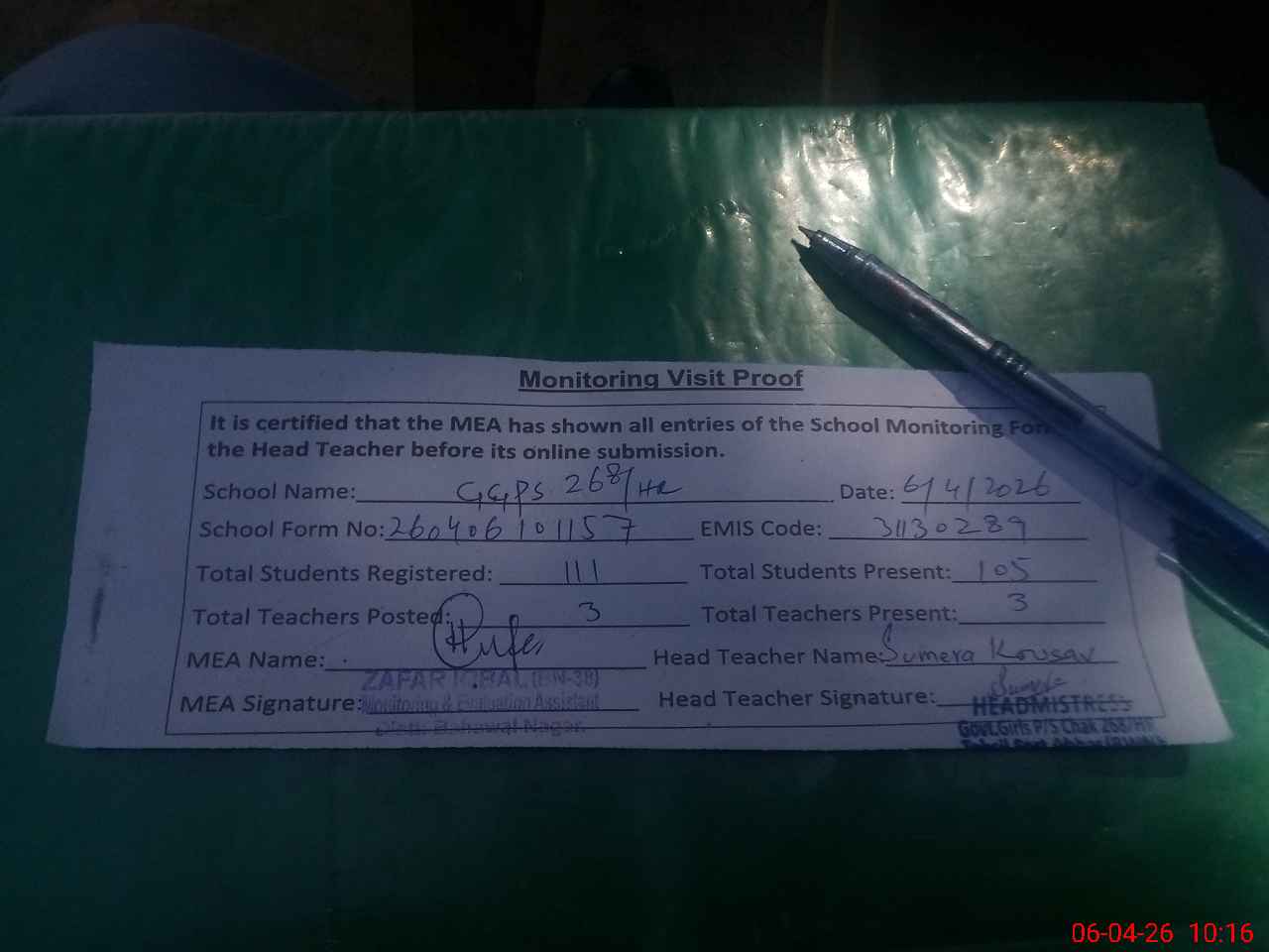 | EMIS Code: 31130289 | Name of School: GGPS CHAK NO 268 HR | |||