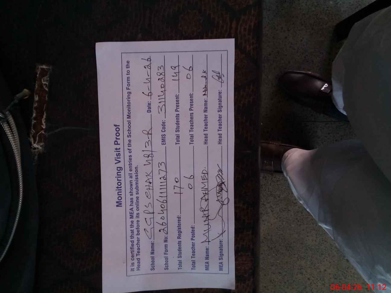 | Attendance Register | Head Teacher | MEA with School | Visit Proof |