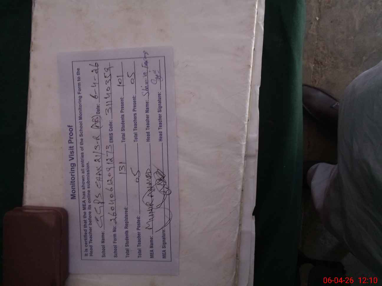 | Attendance Register | Head Teacher | MEA with School | Visit Proof |