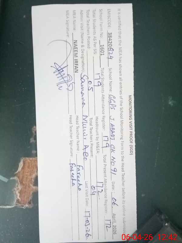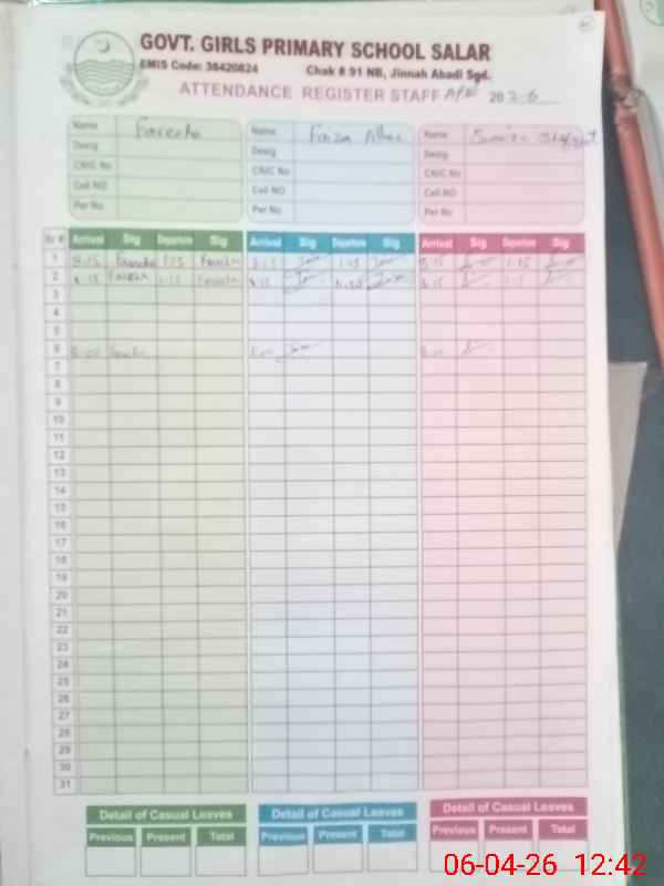 | EMIS Code: 38420824 | Name of School: GGPS SALAR JINAH ABADI CHAK NO. 91-NB | |||
