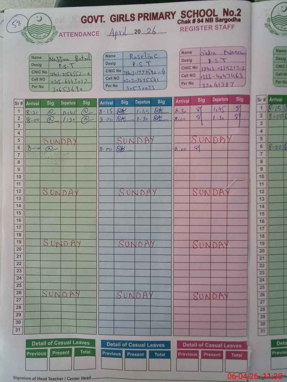 | CNIC | Full Name | Designation | R/C | Absence During Last Calender Month |