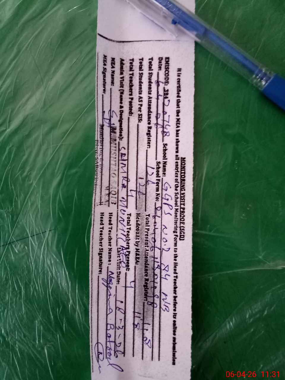 | Attendance Register | Head Teacher | MEA with School | Visit Proof |