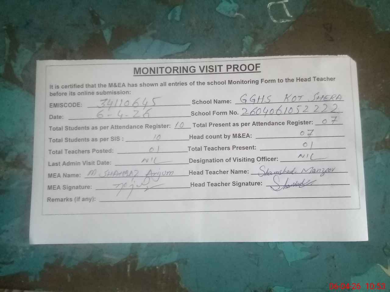 | Attendance Register | Head Teacher | MEA with School | Visit Proof |