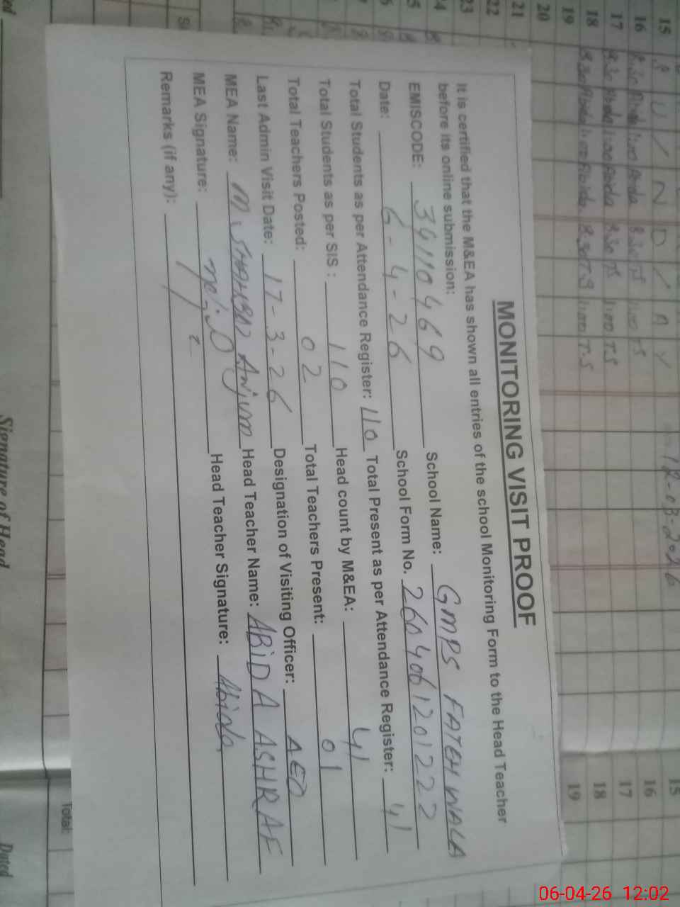 | Attendance Register | Head Teacher | MEA with School | Visit Proof |