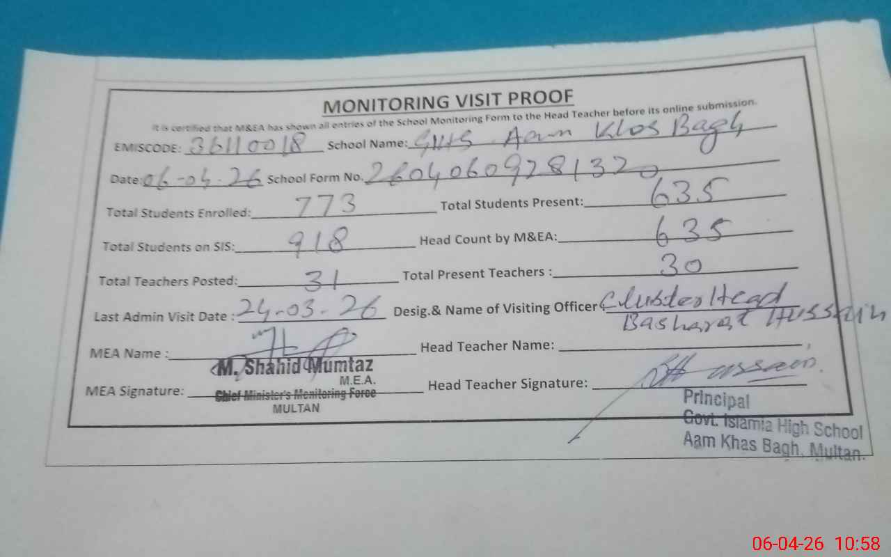 | EMIS Code: 36110018 | Name of School: GHS ISLAMIA AAM KHAS BAGH MULTAN | |||
