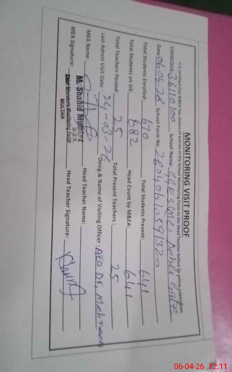 | EMIS Code: 36110100 | Name of School: GGES MC DEHLI GATE MULTAN | |||