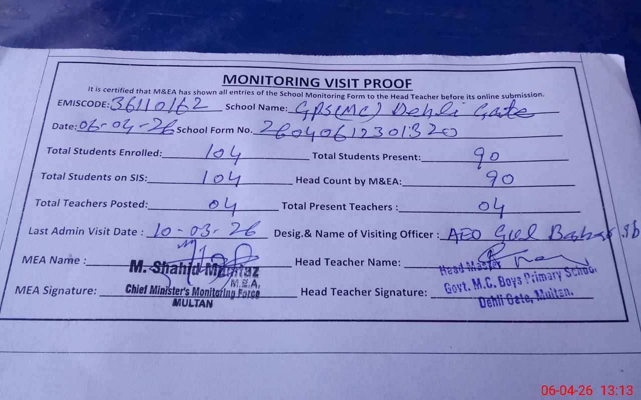 | EMIS Code: 36110162 | Name of School: GPS MC DEHLI GATE MULTAN | |||