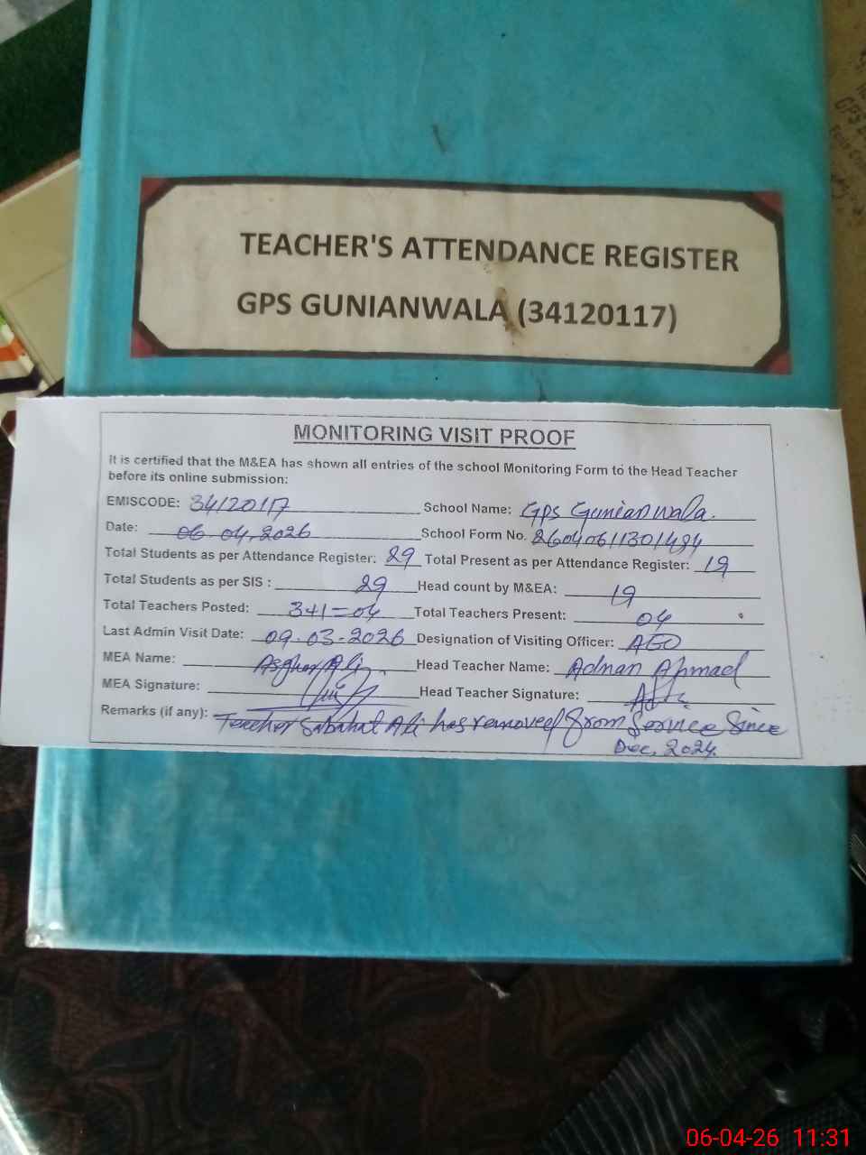| EMIS Code: 34120117 | Name of School: GPS GUNIAN WALA | |||