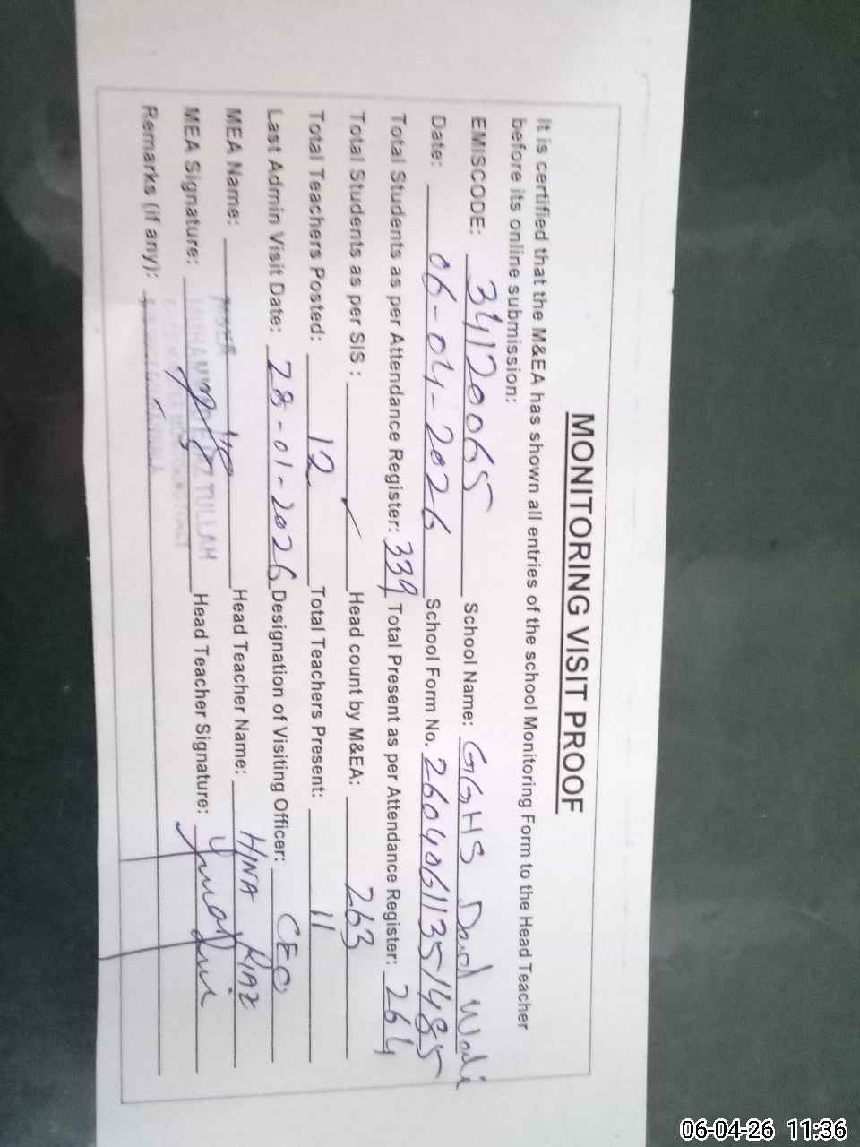 | EMIS Code: 34120065 | Name of School: GGHS DAD WALI | |||