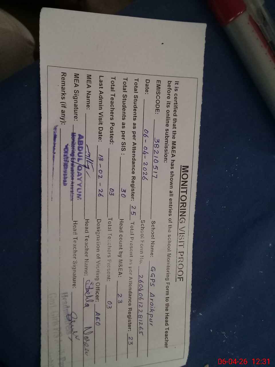 | EMIS Code: 38210517 | Name of School: GGPS ARAIKPUR | |||
