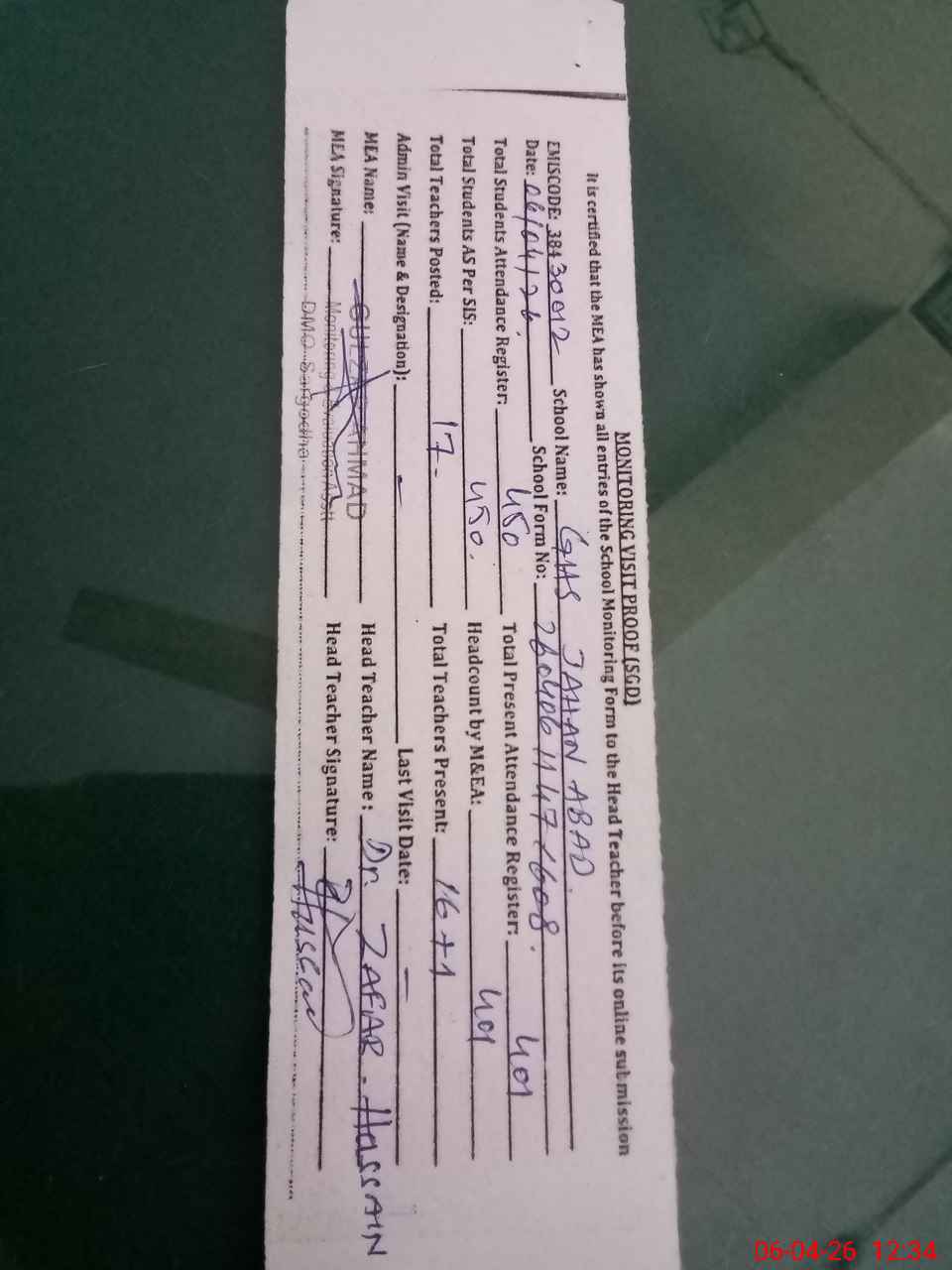 | Attendance Register | Head Teacher | MEA with School | Visit Proof |