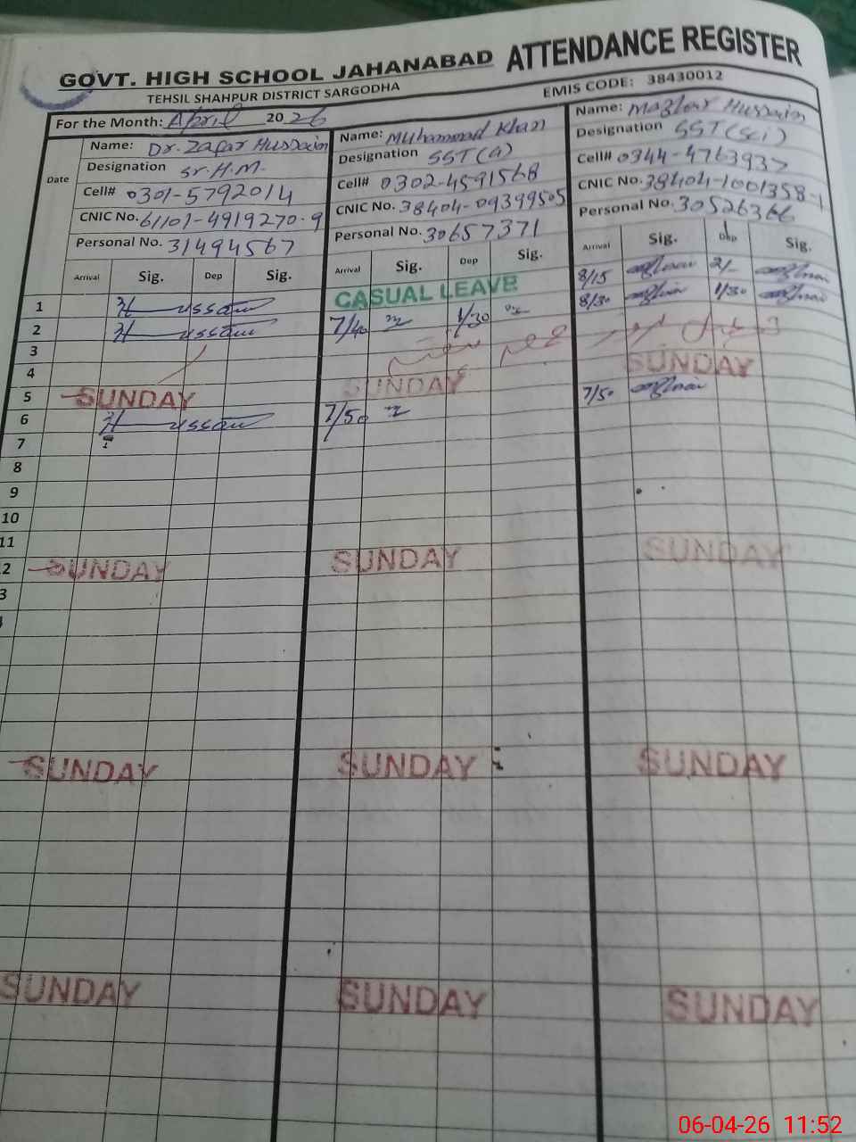 | CNIC | Full Name | Designation | R/C | Absence during last cal. month |