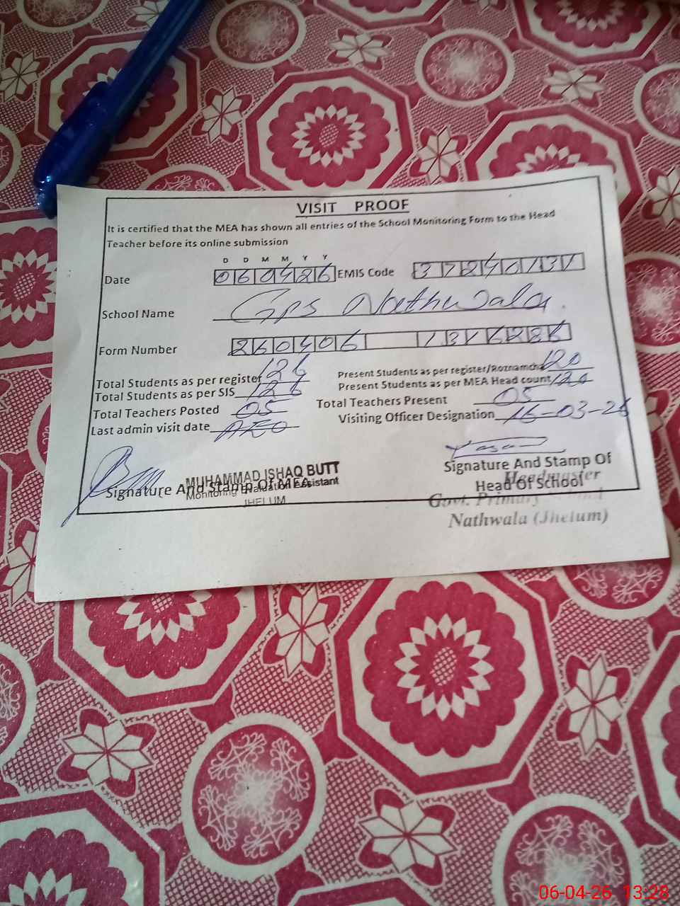 | Attendance Register | Head Teacher | MEA with School | Visit Proof |