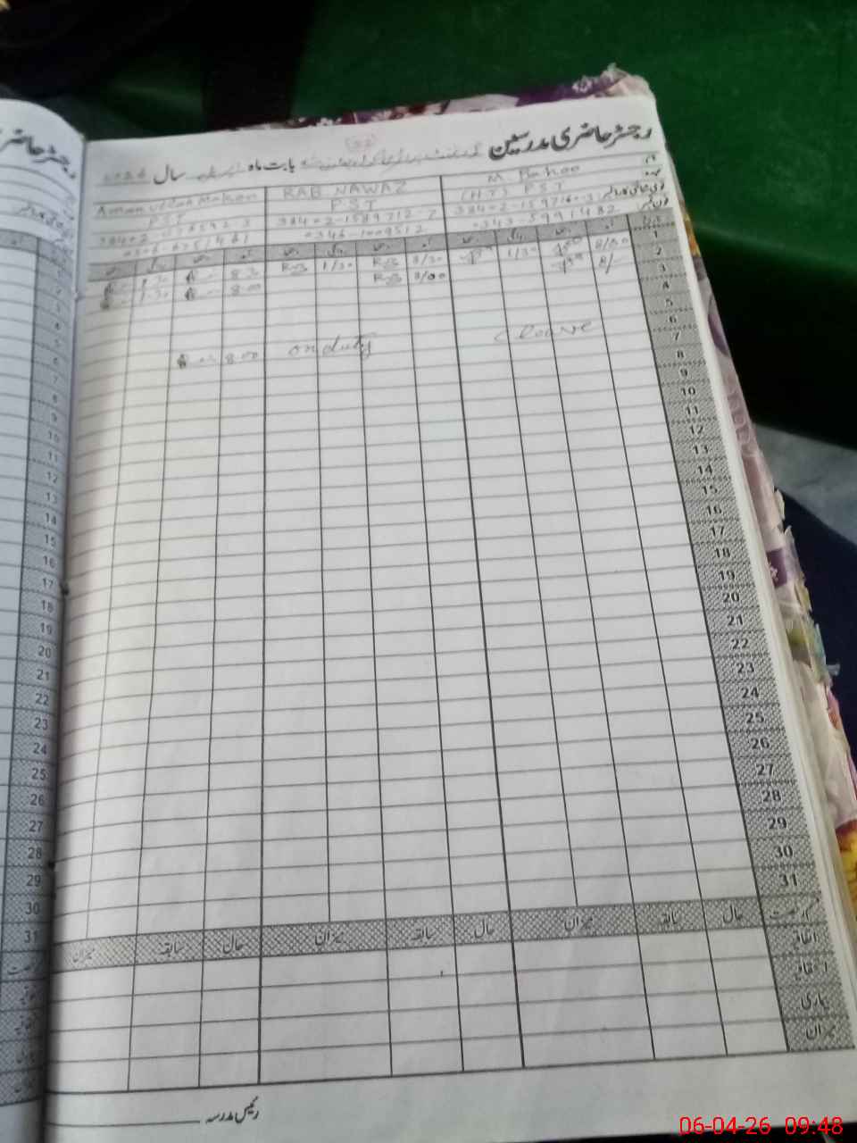 | CNIC | Full Name | Designation | R/C | Absence During Last Calender Month |