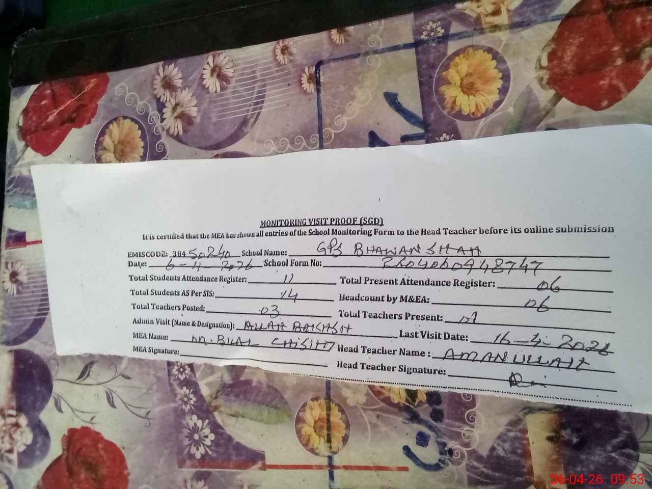 | Attendance Register | Head Teacher | MEA with School | Visit Proof |