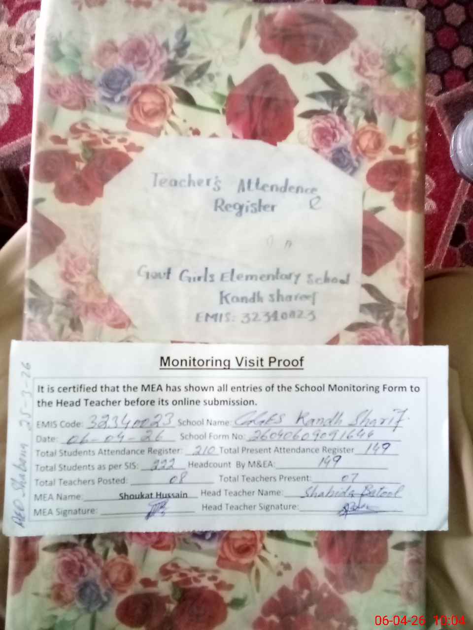 | Attendance Register | Head Teacher | MEA with School | Visit Proof |