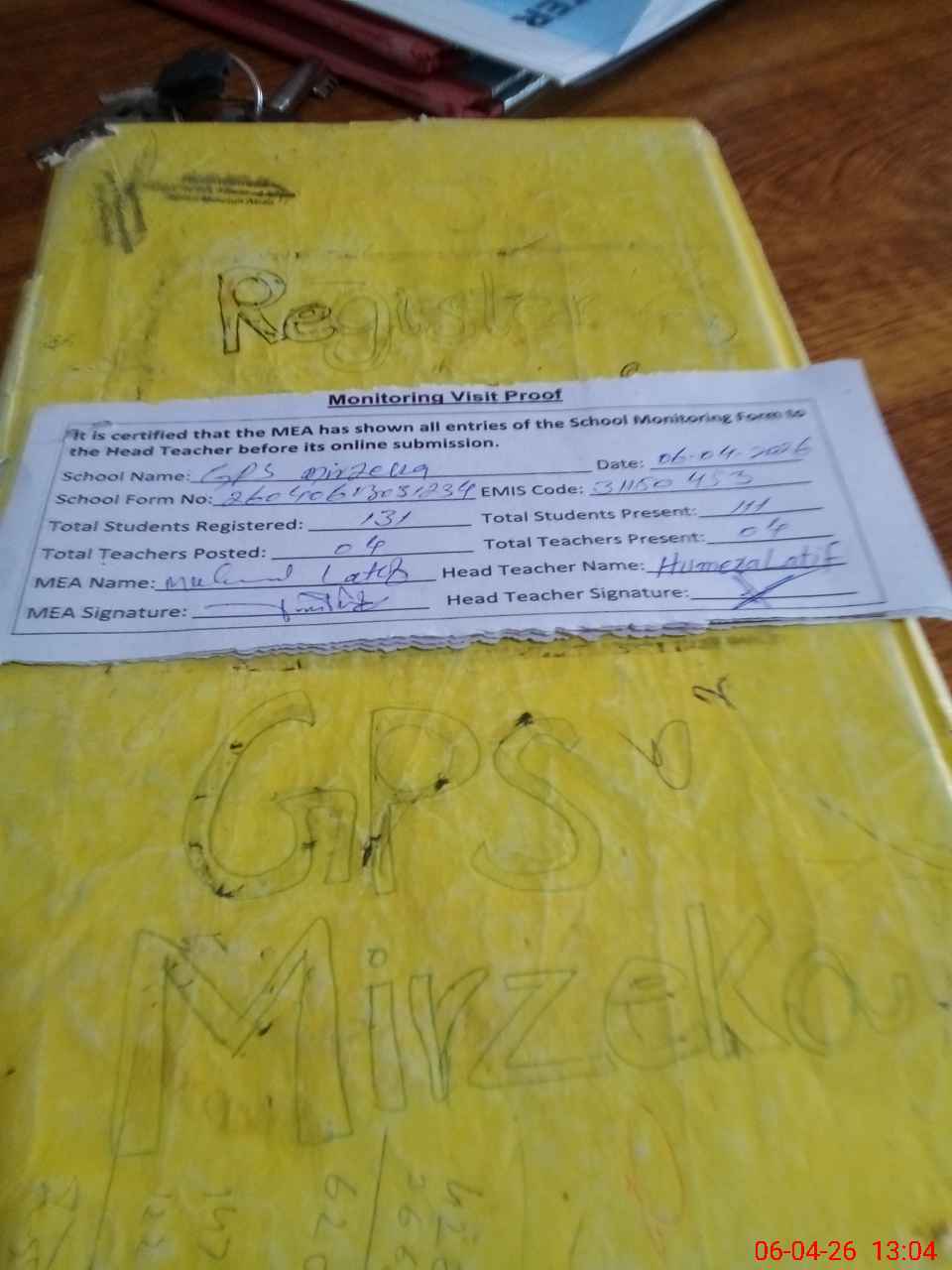 | Attendance Register | Head Teacher | MEA with School | Visit Proof |