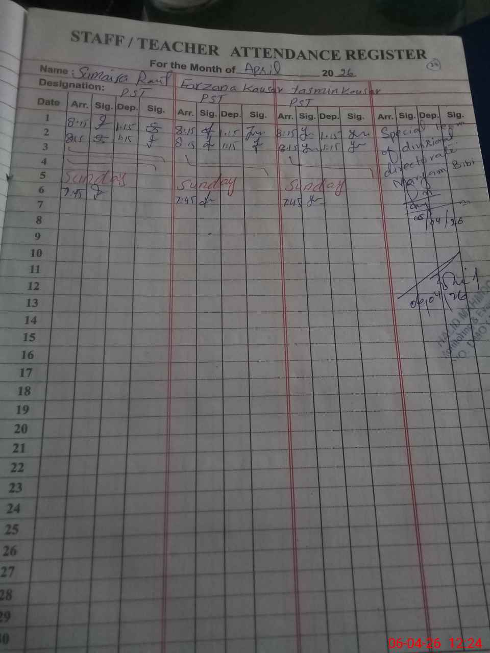 | CNIC | Full Name | Designation | R/C | Absence During Last Calender Month |