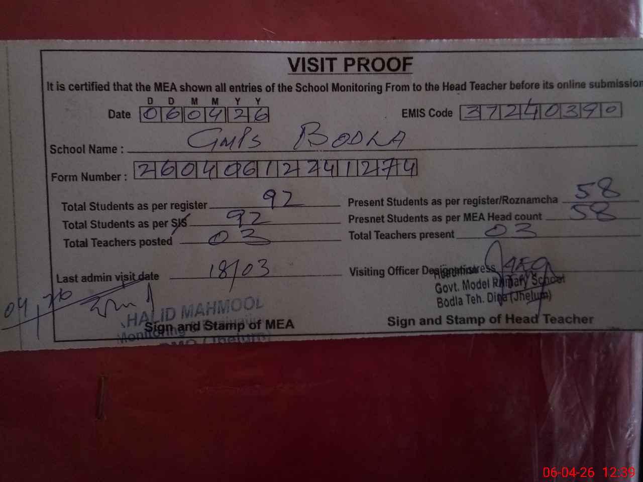| Attendance Register | Head Teacher | MEA with School | Visit Proof |